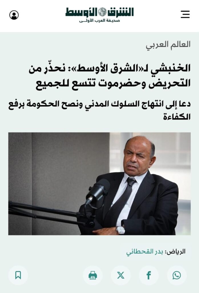 الخنبشي لـ«الشرق الأوسط»: نحذّر من التحريض وحضرموت تتسع للجميع