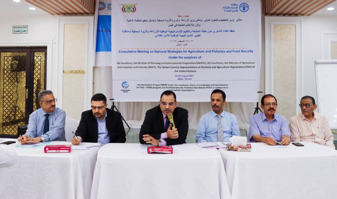 دشن وزير الزراعة والري والثروة السمكية، اللواء سالم السقطري، اليوم، ورشة العمل الخاصة بمناقشة المسودة النهائية للإستراتيجية الوطنية للزراعة والثروة السمكية، التي أعدتها الوزارة بالتعاون مع خبراء من منظمة الأغذية والزراعة (الفاو).