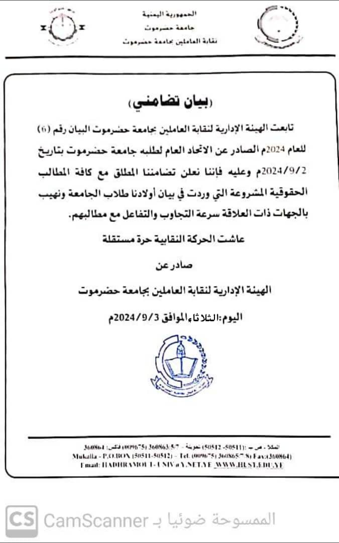 تابعت الهيئة الإدارية لنقابة العاملين بجامعة حضرموت البيان رقم (6) للعام 2024م الصادر عن الاتحاد العام لطلبه جامعة حضرموت بتاريخ 2/9/2024م وعليه فإننا نعلن تضامننا المطلق مع كافة المطالب الحقوقية المشروعة التي وردت في بيان أولادنا طلاب الجامعة ونهيب بالجهات ذات العلاقة سرعة التجاوب والتفاعل مع مطالبهم.
