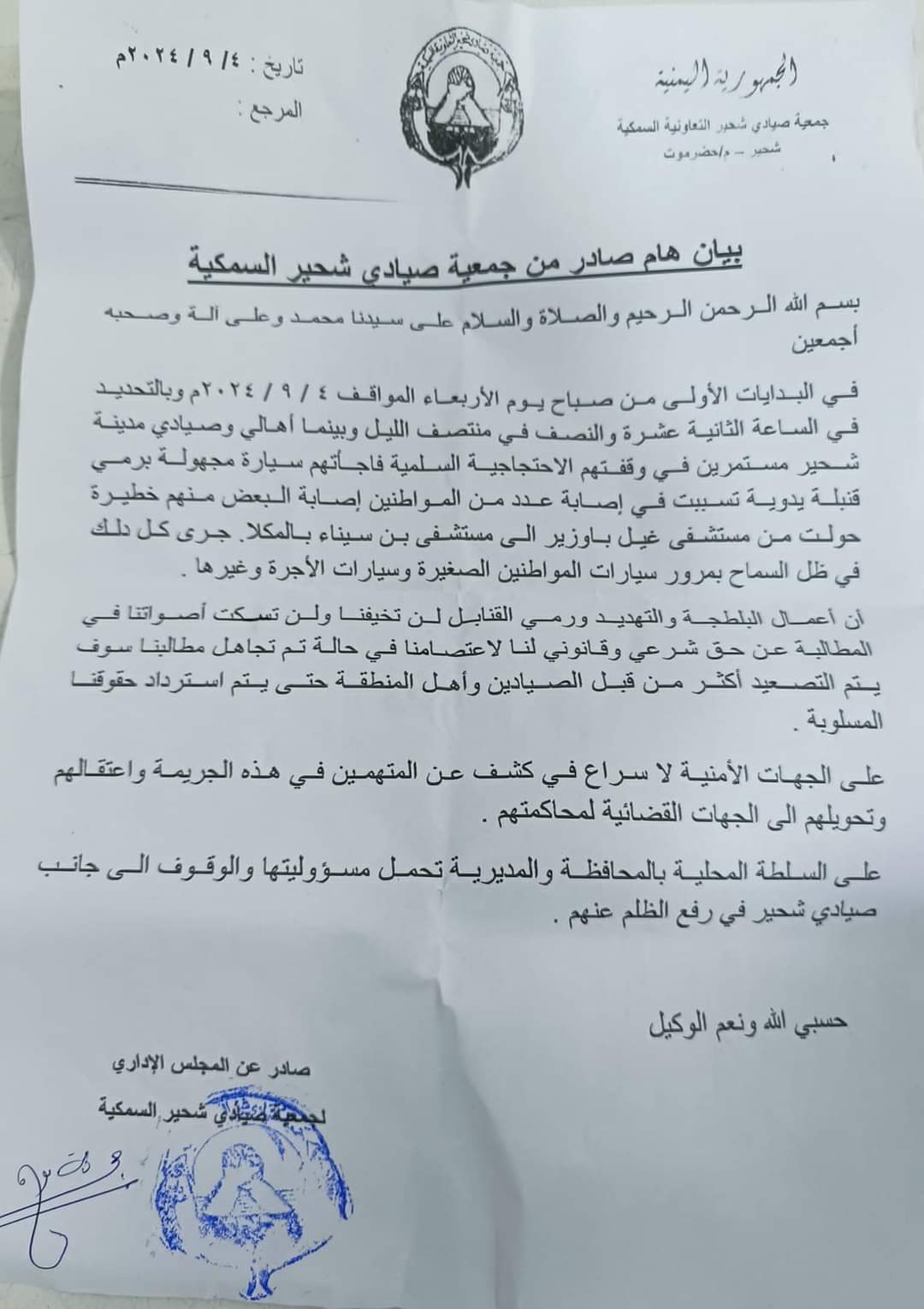 وجاء في البيان أن اعتصام الصيادين السلمي تعرض في الساعات الأولى من صباح اليوم الأربعاء لهجوم بقنبلة يدوية ألقتها سيارة مجهولة، مما أسفر عن إصابة عدد من المعتصمين، بينهم حالات خطيرة.