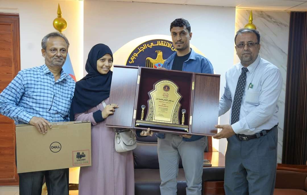 وخلال التكريم، قدّم الأستاذ منيف الجفري، مدير الإدارة التنظيمية بانتقالي العاصمة عدن، للطالبات روان عبدالعزيز (القسم العلمي)، وآيات شوقي هاشم (القسم الأدبي)، ولين وضاح (القسم الإنجليزي)، دروع تقديرية وأجهزة لابتوب ومبالغ مالية.