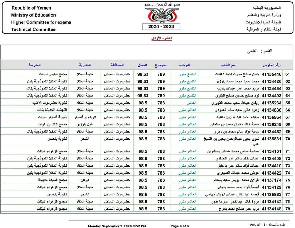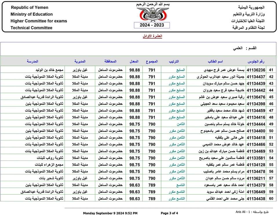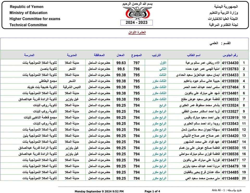 أعلنت وزارة التربية والتعليم صباح اليوم أسماء أوائل شهادة الثانوية العامة على مستوى محافظة حضرموت الساحل بقسميها العلمي والأدبي بإجمالي عدد الأوائل 97 طالباً وطالباً (79) منهم في القسم العلمي و(18) في القسم الأدبي بنسبة نجاح 93% .