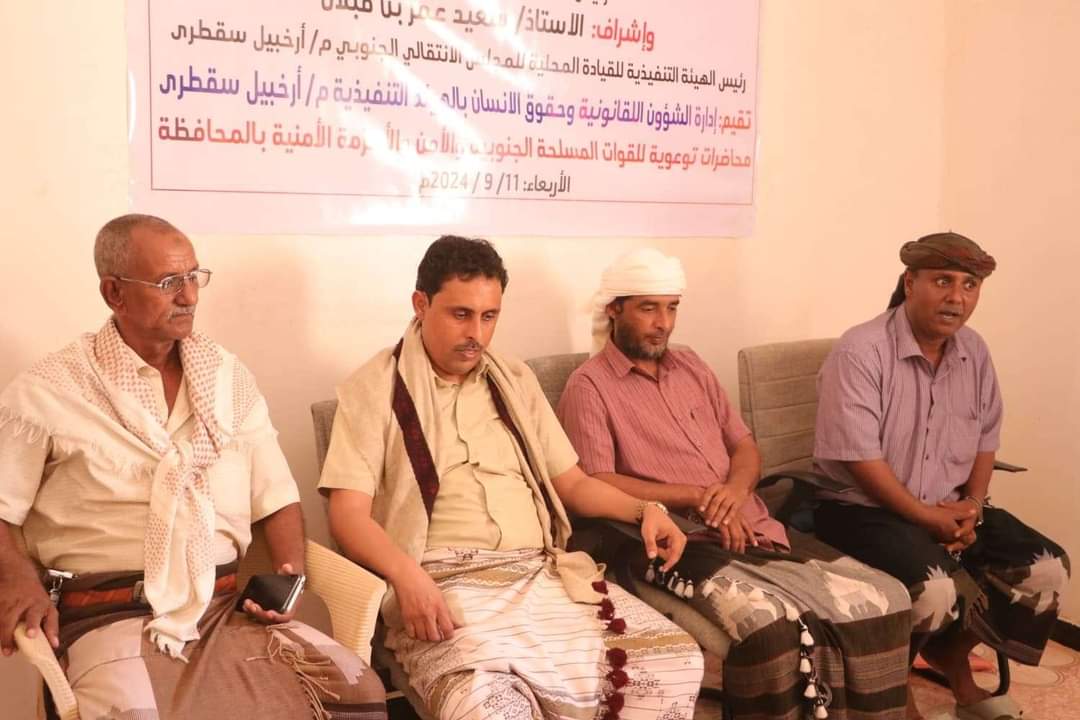 نظمت إدارة الشؤون القانونية وحقوق الإنسان بالهيئة التنفيذية للقيادة المحلية للمجلس الانتقالي الجنوبي في محافظة سقطرى، اليوم الأربعاء، محاضرة توعوية للقوات المسلحة الجنوبية والأجهزة الأمنية، برعاية الرئيس القائد عيدروس الزُبيدي.