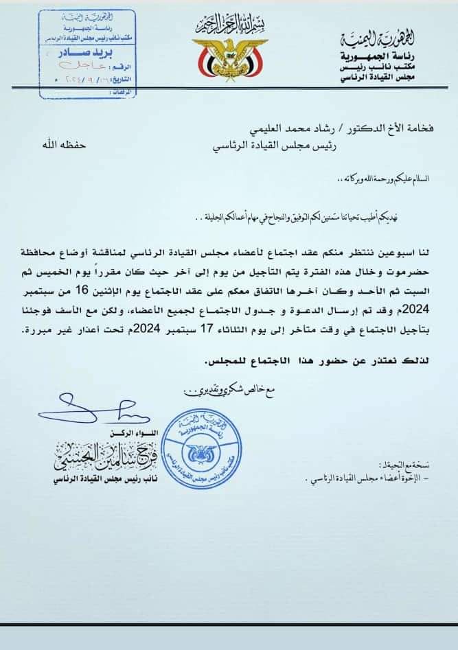 وتحصل موقع (قناة عاد TV) على نسخة ومن وثيقة منسوبة للواء فرج البحسني، خاطب فيها رئيس مجلس القيادة الرئاسي، وأشار فيها إلى اعتذاره عن المشاركة في الاجتماع.