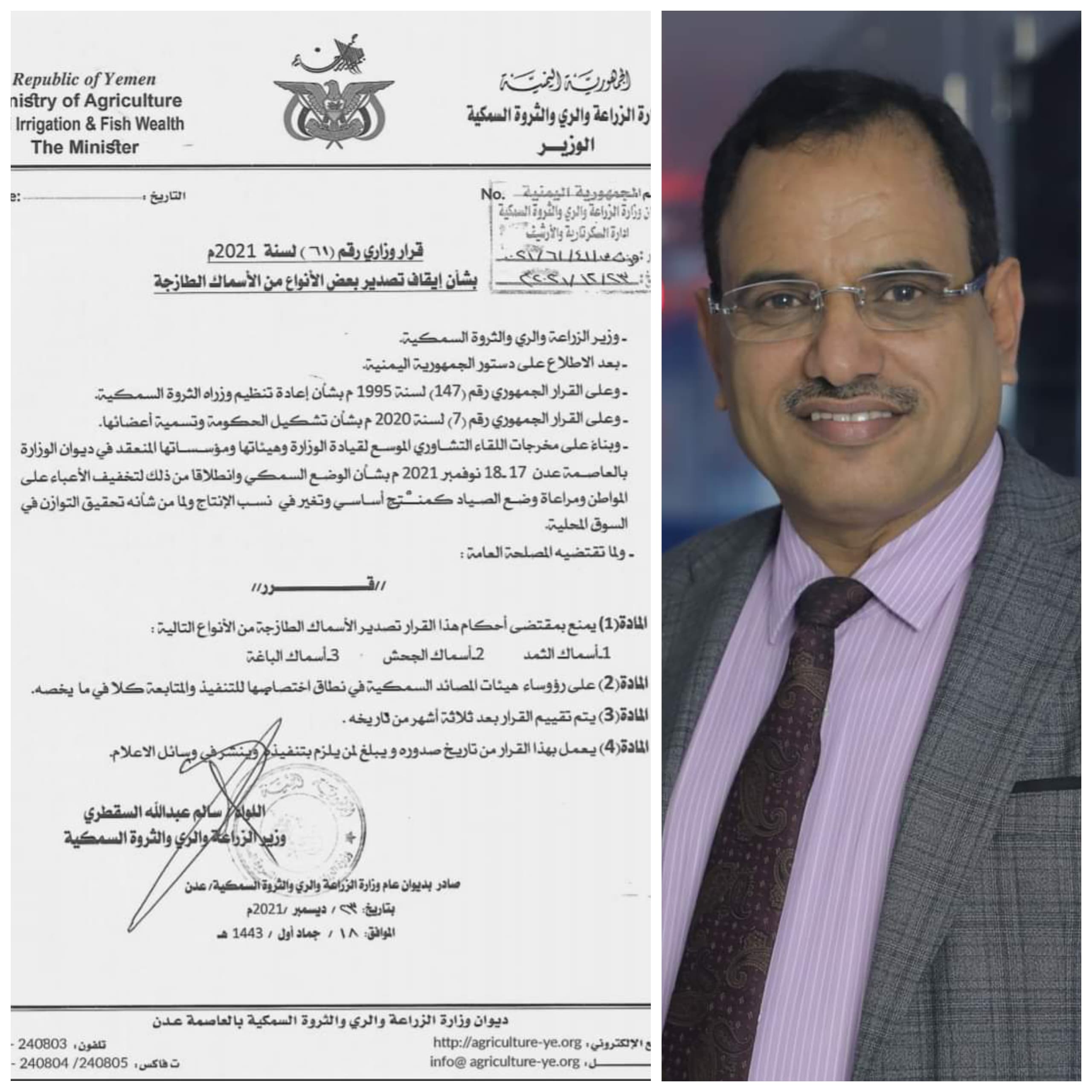 نحو الثلاثة الأعوام ؛ أصدر وزير الزراعة والريّ والثروة السمكية، اللواء سالم السقطري، قرارًا بمنع تصدير بعض أصناف الأسماك الطازجة إلى خارج الوطن، أبرزها أسماك التونة، التي تعد جزءًا أساسيًا من غذاء المواطنين.