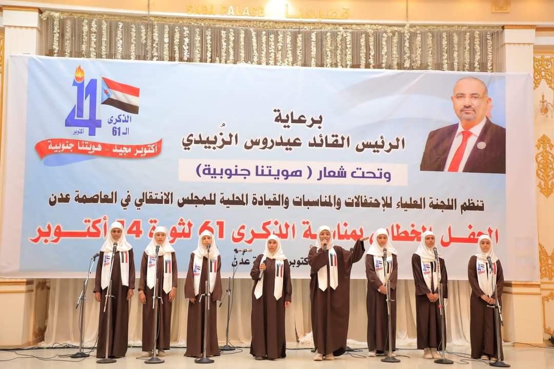 أقام المجلس الانتقالي الجنوبي، اليوم الثلاثاء بالعاصمة عدن، حفلاً فنياً وخطابياً بمناسبة الذكرى الـ61 لثورة 14 أكتوبر المجيدة، تحت شعار “هويتنا جنوبية” نظمته اللجنة العليا للمناسبات الوطنية بالتعاون مع القيادة المحلية للمجلس الانتقالي بالعاصمة عدن، برعاية الرئيس القائد عيدروس الرُبيدي، رئيس المجلس الانتقالي الجنوبي.