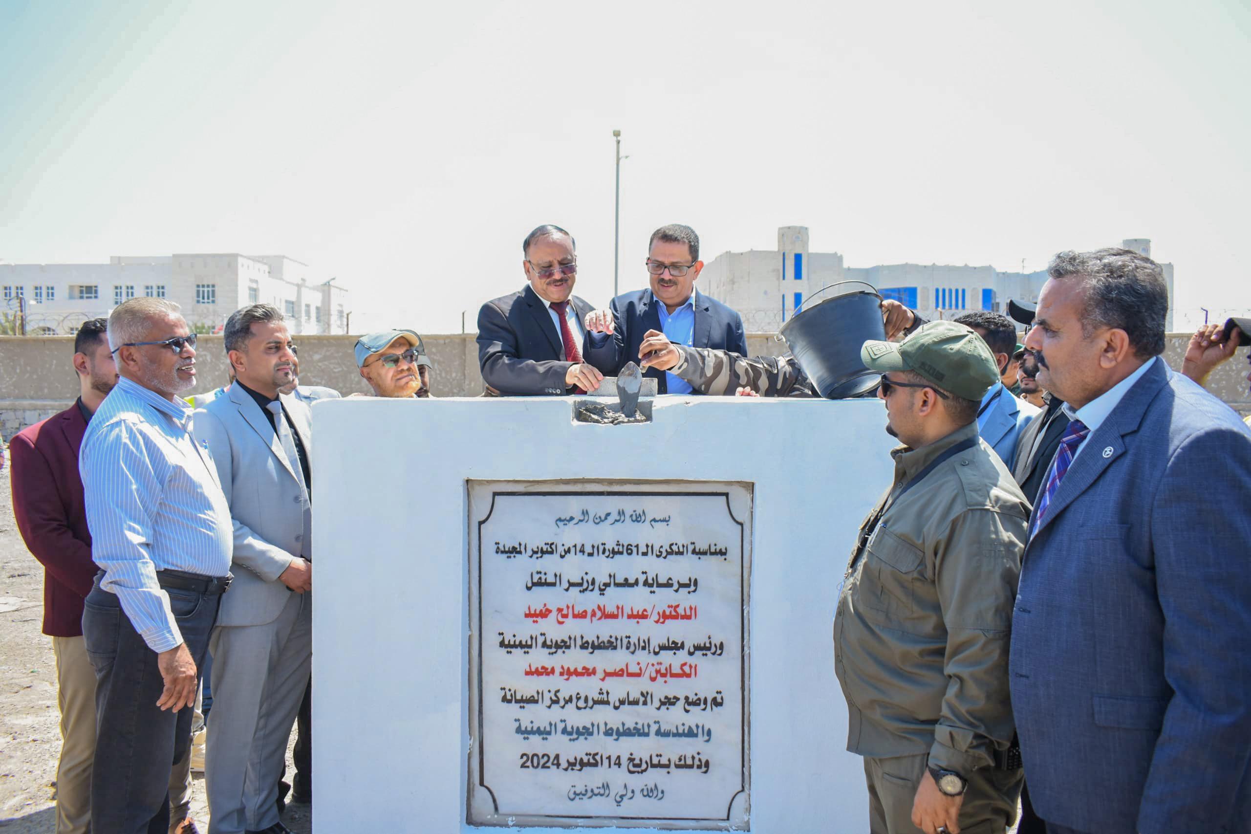 وضع معالي وزير النقل الدكتور عبدالسلام صالح حُميد، ومعه رئيس مجلس إدارة شركة الخطوط الجوية اليمنية الكابتن ناصر محمود محمد، اليوم، حجر الأساس لمشروع مركز الصيانة والهندسة الإقليمي للخطوط الجوية اليمنية في مطار عدن الدولي.