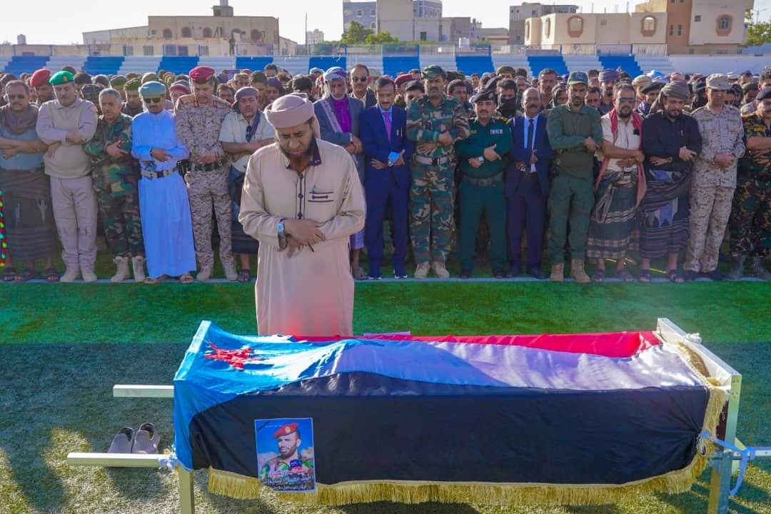 شيعت جموع حاشدة، اليوم الاربعاء، جثمان الشهيد العقيد أحمد محسن السليماني، أركان اللواء الأول دفاع شبوة، يتقدمهم عضو هيئة رئاسة المجلس الانتقالي الجنوبي الأستاذ فادي باعوم، ومساعد الأمين العام للأمانة العامة للمجلس الانتقالي لشؤون المحافظات والمنسقيات الاستاذ محمد الشقي، ورئيس تنفيذية انتقالي شبوة الشيخ لحمر علي لسود، ومحافظ محافظة شبوة الشيخ عوض بن الوزير.
