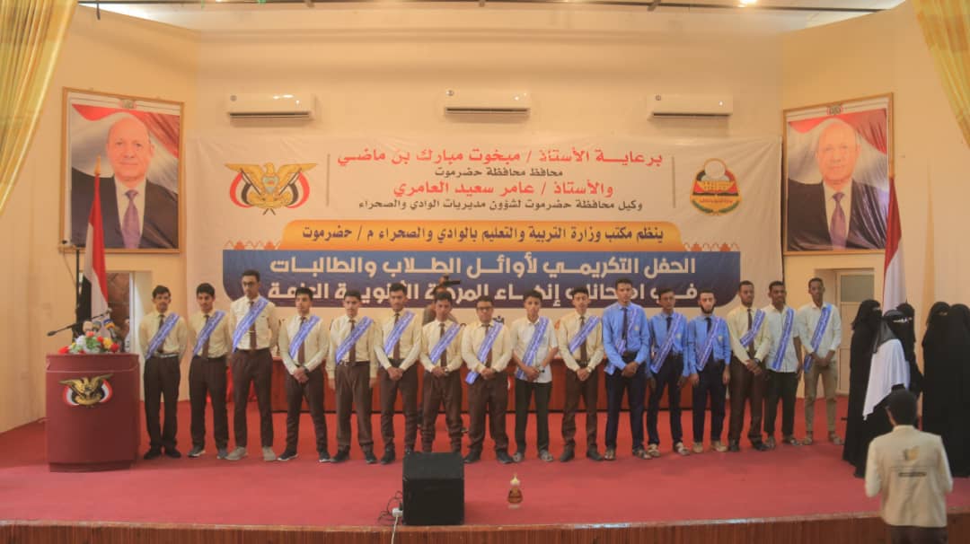 كرّم وكيل محافظة حضرموت لشؤون مديريات الوادي والصحراء ،صباح اليوم، 81 من الطلاب والطالبات الأوائل في امتحانات انهاء المرحلة الثانوية العامة، للعام الدراسي 2023 – 2024م في حفل تكريمي نظمة مكتب وزارة التربية والتعليم بوادي حضوموت والصحراء.