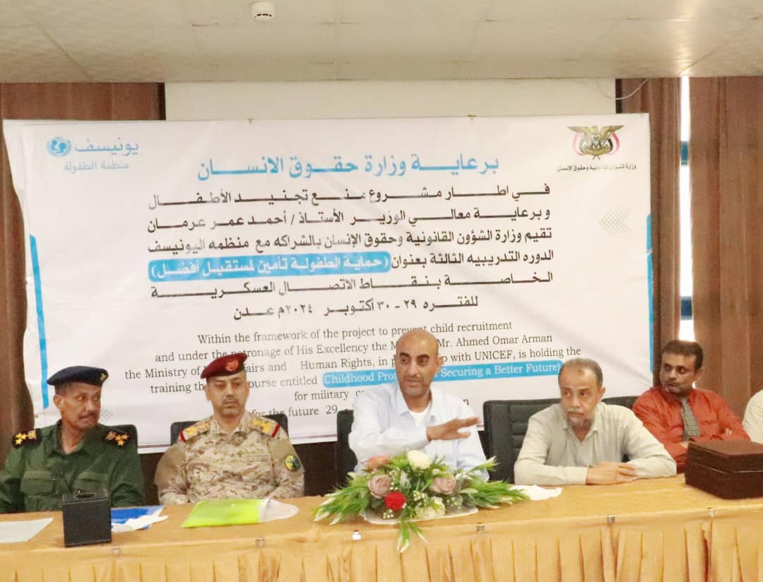 اختتمت وزارة الشؤون القانونية وحقوق الإنسان، بالشراكة مع منظمة اليونيسف “للطفولة”، اليوم بعدن، فعاليات الدورة التدريبية الثانية لنقاط الاتصال العسكرية بعنوان (حماية الطفولة تأمين لمستقبل أفضل).
