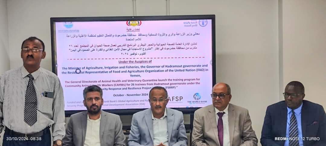 برعاية اللواء / سالم السقطري وزير الزراعة والري والثروة السمكية دشن مدير عام الصحة الحيوانية بالوزارة الدكتور عبدالرحمن الخطيب بحضور وكيل محافظة حضرموت للشؤون الفنية م. امين الرزيقي ومدير عام مكتب الزراعة عبدالله العوبثاني الدورة التدريبية لعمال الصحة الحيوانية المجتمعين في محافظة حضرموت الساحل وذلك ضمن مشروعي التكيف مع التغيير المناخي و الإستجابة في مجال الأمن الغذائي والقدرة على الصمود في اليمن والتي تنفذها وزارة الزراعة والأسماك بالتعاون مع منظمة “الفاو” بتمويل من مجموعة البنك الدولي وصندوق البيئة.