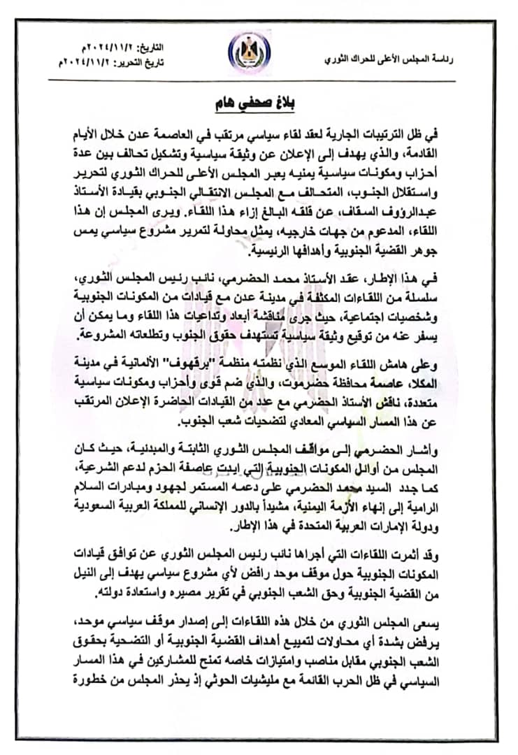 في ظل الترتيبات الجارية لعقد لقاء سياسي مرتقب في العاصمه عدن خلال الأيام القادمه، والذي يهدف إلى الإعلان عن وثيقة سياسية وتشكيل تحالف بين عدة أحزاب ومكونات سياسية يمنيه يعبر المجلس الأعلى للحراك الثوري لتحرير واستقلال الجنوب، المتحالف مع المجلس الانتقالي الجنوبي بقيادة الأستاذ عبدالروؤف السقاف، عن قلقه البالغ إزاء هذا اللقاء. ويرى المجلس إن هذا اللقاء، المدعوم من جهات خارجيه، يمثل محاولة لتمرير مشروع سياسي يمس جوهر القضية الجنوبية وأهدافها الرئيسية.