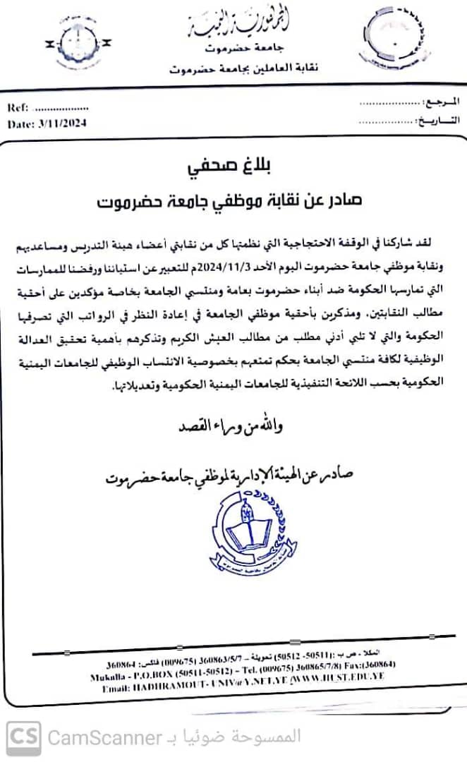 صادر عن الهئية الإدارية لنقابة موظفي جامعة حضرموت