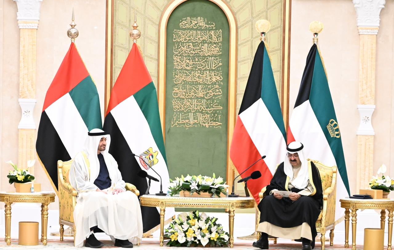 عقد امير دولة الكويت، صاحب السمو الشيخ مشعل الأحمد الجابر الصباح، ورئيس دولة الإمارات العربية المتحدة، صاحب السمو الشيخ محمد بن زايد آل نهيان، اليوم، بقصر بيان، جلسة مباحثات رسمية بحضور عدد من كبار المسؤولين في البلدين.