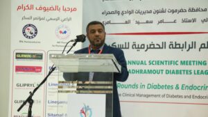 دشن وكيل محافظة حضرموت لشؤون مديريات الوادي والصحراء الأستاذ عامر سعيد العامري، صباح اليوم، اللقاء العلمي الخامس للرابطة الحضرمية للسكري والذي يقام تحت عنوان ” جولات سريرية في اضطرابات الغدد الصماء والسكري” تزامناً مع اليوم العالمي للسكري الموافق 14 نوفمبر.