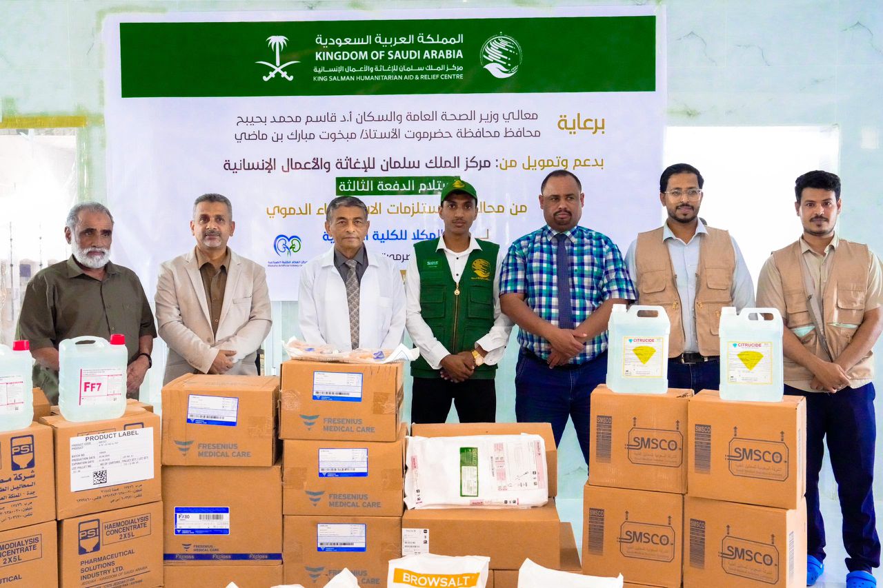 بدعم وتمويل من مركز الملك سلمان للإغاثة والأعمال الإنسانية، تسلم مركز المكلا للكلية الصناعية اليوم الدفعة الثالثة لعدد( 2683 ) جلسة استصفاء من محاليل ومستلزمات الاستصفاء الدموي، بهدف تعزيز الخدمات المقدمة للمرضى في محافظة حضرموت ضمن مشروع دعم مراكز الغسيل الكلوي بالجمهورية اليمنية بالمحاليل والمستلزمات الطبية (المرحلة الثالثة).