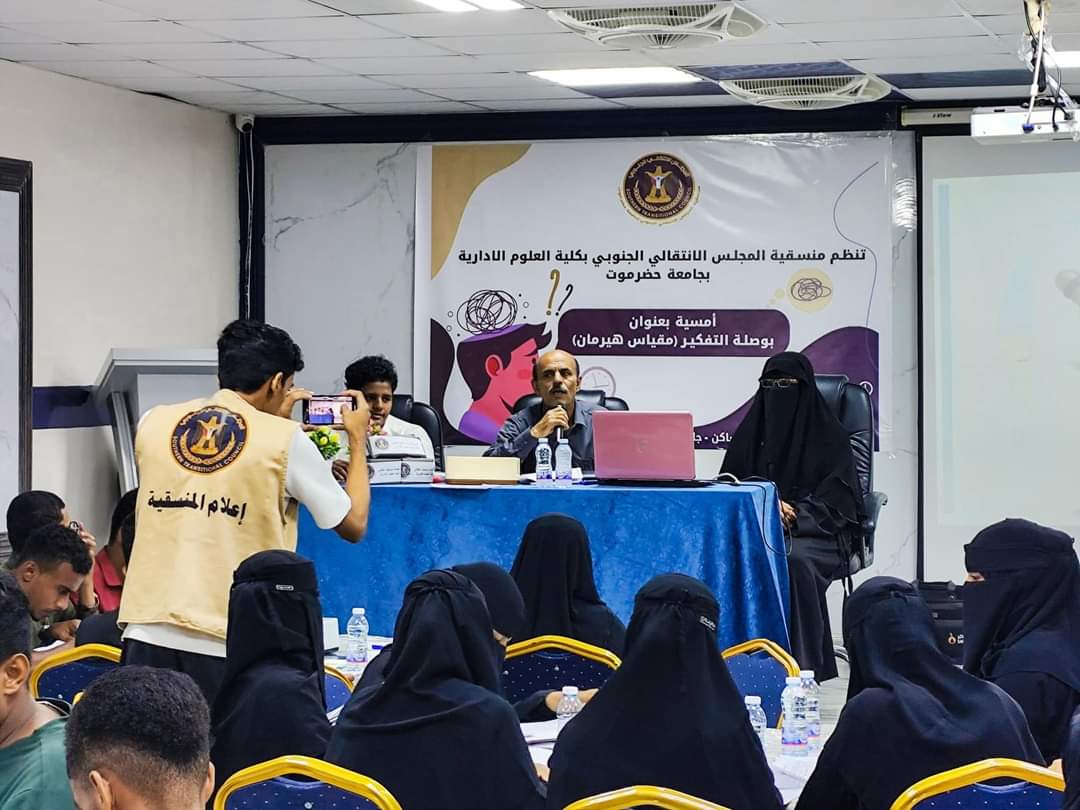 نظمت الهيئة التنفيذية لمنسقية المجلس الانتقالي بكلية العلوم الإدارية بجامعة حضرموت، مساء الخميس، أمسية تدريبية بعنوان بوصلة التفكير (ميقاس هيرمان) لطلاب الكلية والتي استهدفت 70 طالباً بقاعة طب الأسرة.