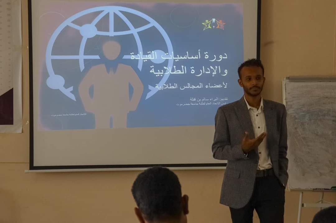 نظّم المجلس الطلابي بكلية العلوم بجامعة حضرموت، في قاعة الدراسات العليا، دورة تدريبية بعنوان “أساسيات القيادة والإدارة الطلابية” قدمها رئيس الاتحاد العام لطلبة جامعة حضرموت البراء سالم بن قفلة، برعاية من عمادة الكلية وبتمويل منسقيّة انتقالي جامعة حضرموت، استهدفت أعضاء المجالس الطلابية بكليتي العلوم والتربية.