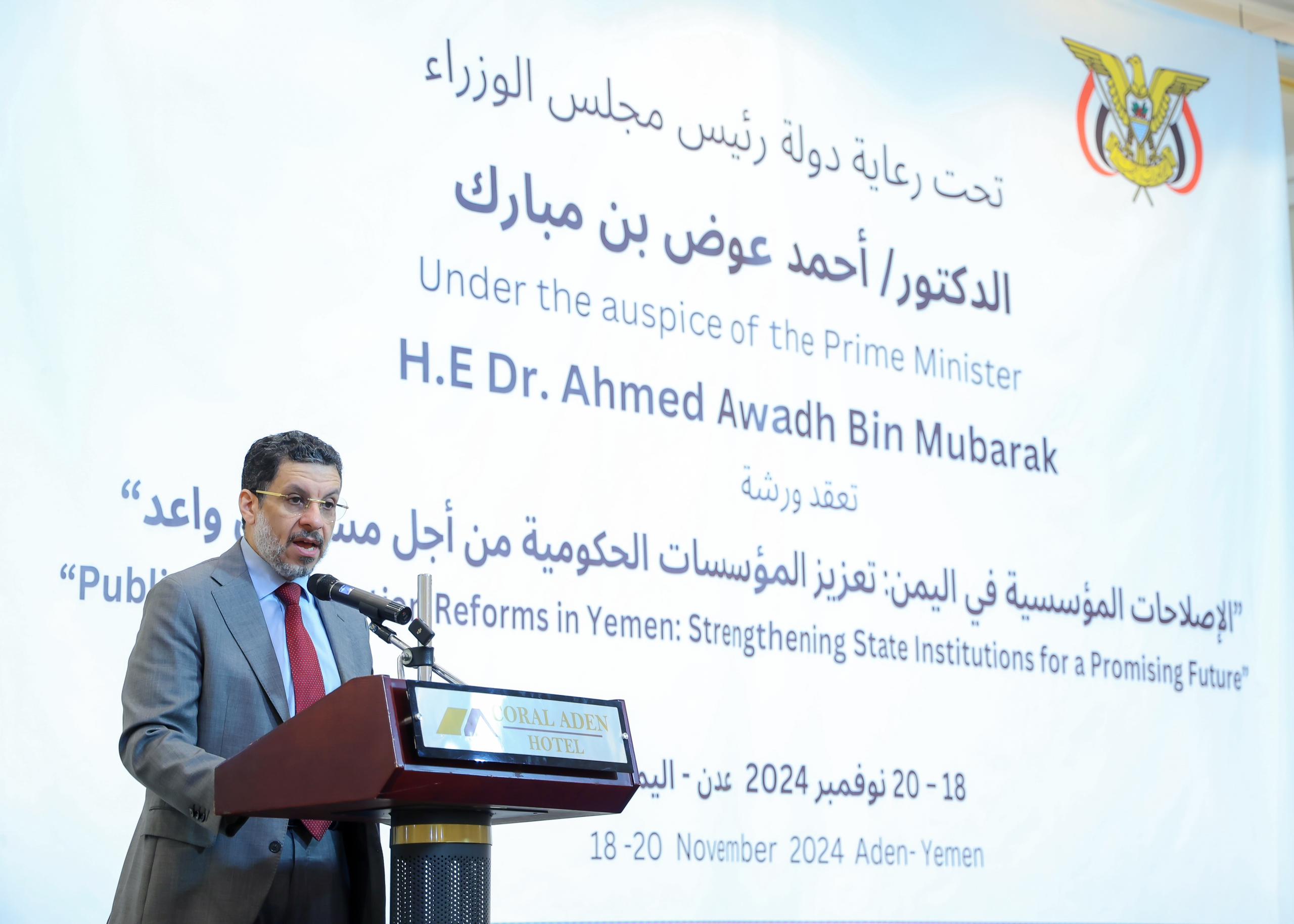 افتتح رئيس مجلس الوزراء الدكتور أحمد عوض بن مبارك، اليوم الاثنين، في العاصمة المؤقتة عدن، ورشة العمل الوطنية حول الإصلاحات المؤسسية في اليمن: تعزيز مؤسسات الدولة من اجل مستقبل واعد.