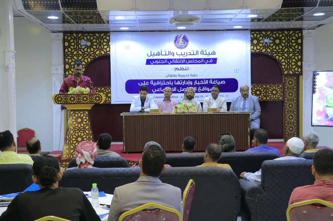دشنت هيئة التدريب والتأهيل المساعدة لهيئة رئاسة المجلس الانتقالي الجنوبي، بالتنسيق مع إدارة الإعلام والثقافة بالهيئة التنفيذية المساعدة للمجلس الانتقالي لشؤون مديريات وادي وصحراء حضرموت، اليوم الأحد، بسيئون، دورة تدريبية بعنوان “صياغة الأخبار وإدارتها باحترافية على مواقع التواصل الاجتماعي”