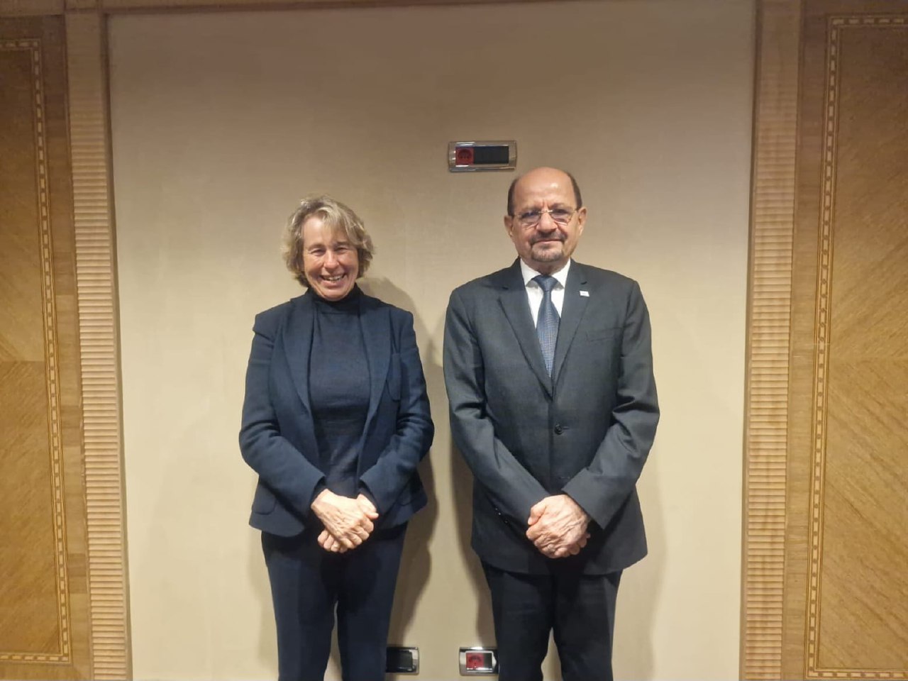 سفيرة اليمن لدى إيطاليا والمندوبة الدائمة لدى المنظمات الدولية العاملة في روما، اسمهان الطوقي، ومدير دائرة مكتب الوزير، السفير عبد القادر هادي.