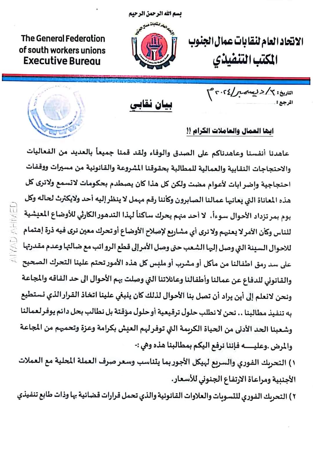 1 – الإعلان عن الاضراب الشامل والمفتوح لكل النقابات المنضوية تحت مظلة الإتحاد العام لنقابات عمال الجنوب حتى تحقيق كافة مطالبنا ابتداء من يوم الاحد الموافق (٨ – ديسمبر – ٢٠٢٤م).