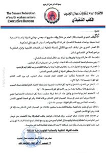 وفي حالة عدم الاستجابة لمطالبنا فإن الاتحاد العام لنقابات عمال الجنوب قرر يوم الأحد القادم الموافق (۸/ ديسمبر / ٢٠٢٤م) الآتي: