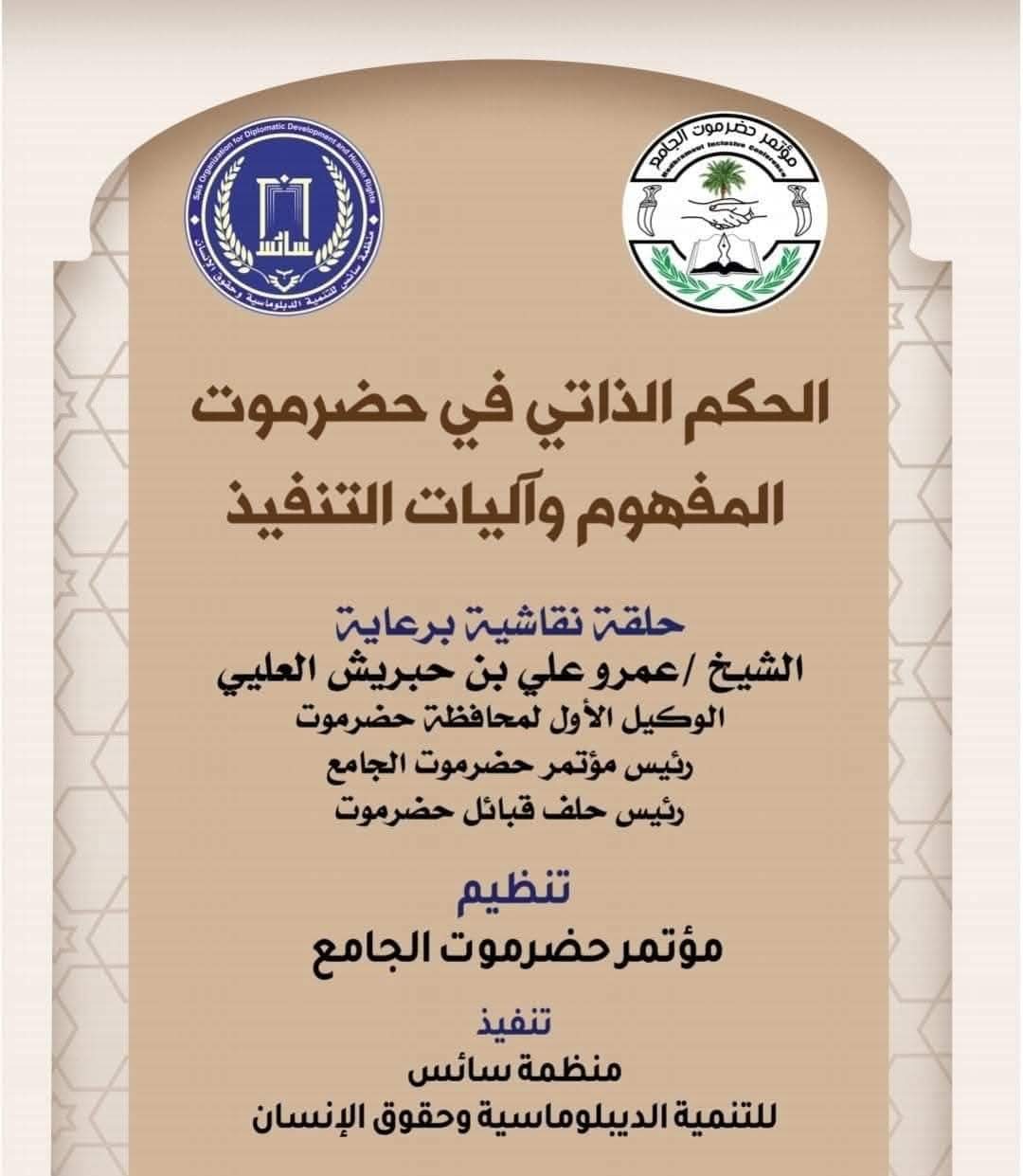 ينظم مؤتمر حضرموت الجامع السبت القادم في مدينة المكلا حلقة نقاشية بعنوان : «الحكم الذاتي في حضرموت المفهوم آليات التنفيذ».