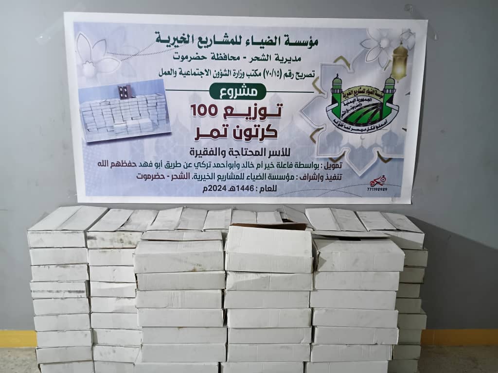 وزعت مؤسسة الضياء للمشاريع الخيرية بمديرية الشحر ١٠٠ كرتون من التمور على الاسر المحتاجة والفقيرة والارامل والايتام في مديرية الشحر وذلك بدعم من فاعلي الخير جزاهم الله خير الجزاء والثواب