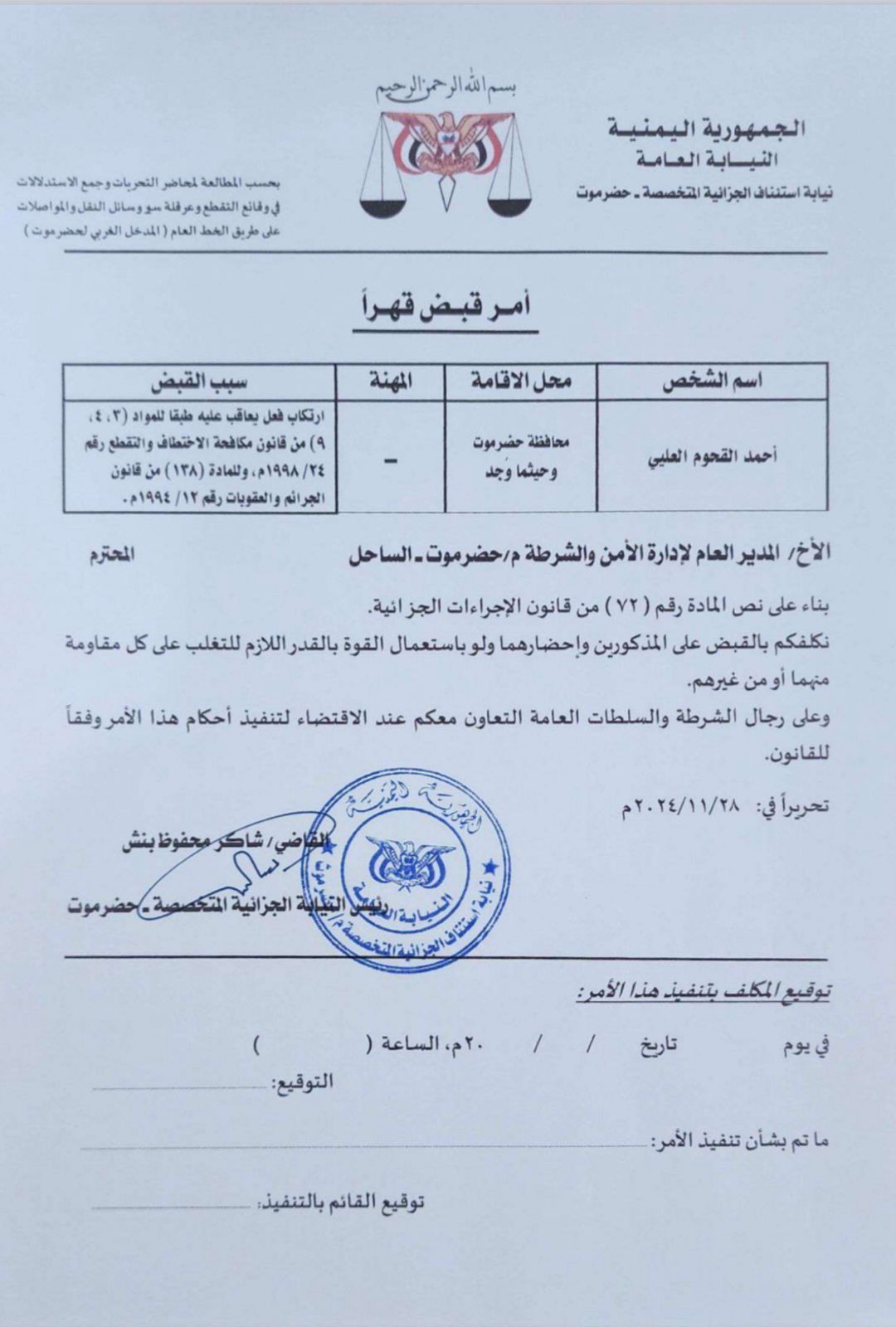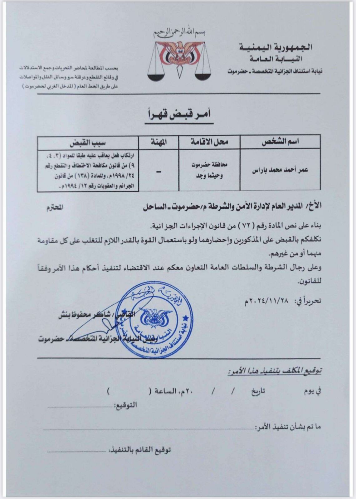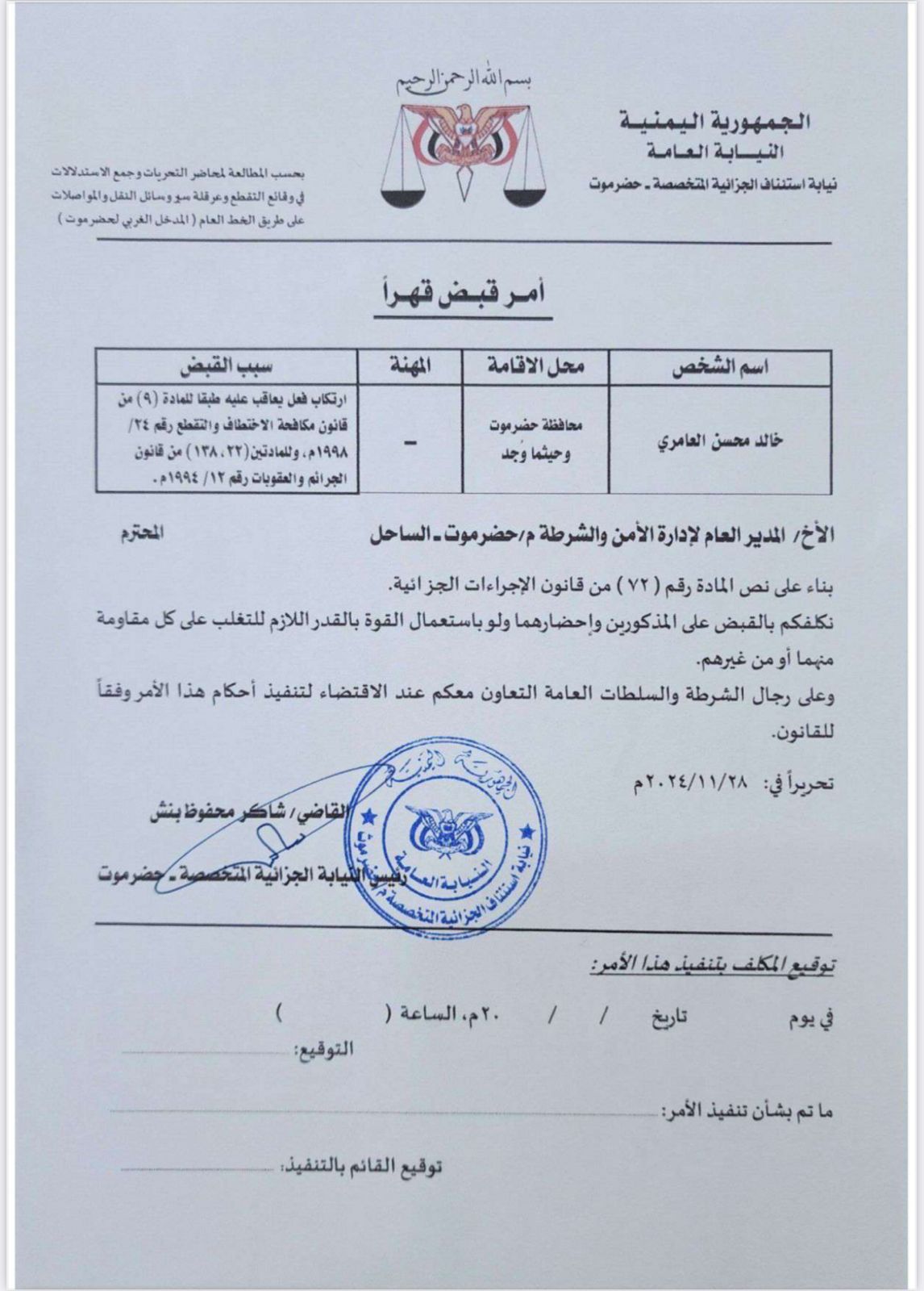 في تصعيداً جديد هو الأخطر، إصدارت النيابة الجزائية في محافظة حضرموت أوامر قبض قهرية بحق قيادات في حلف قبائل حضرموت، بينهم الشيخ خالد محسن العامري، وفائز بادبيان، وخالد باراس، بتهمة التقطع لقواطر النفط الخام لكهرباء عدن.