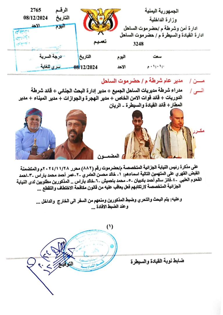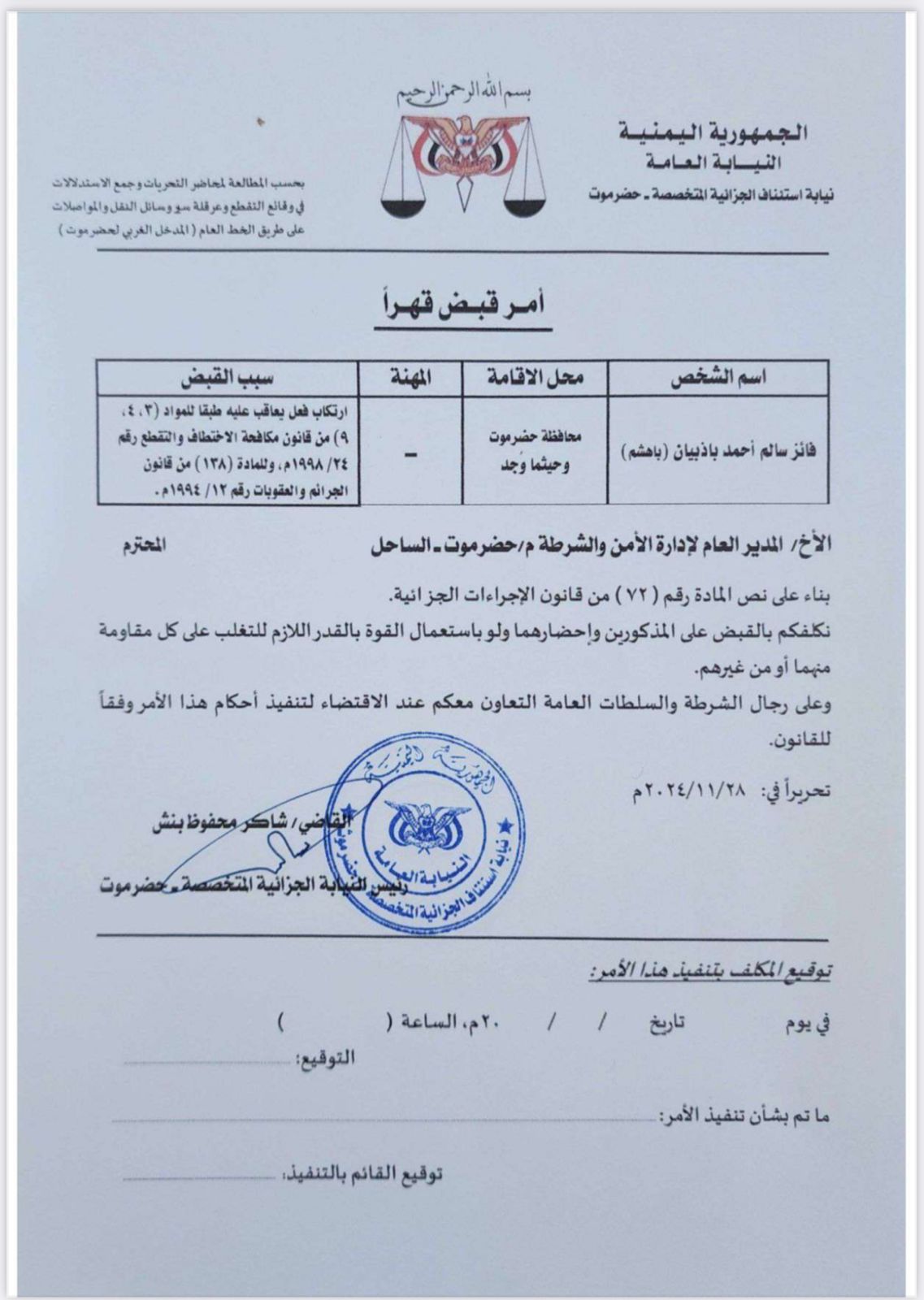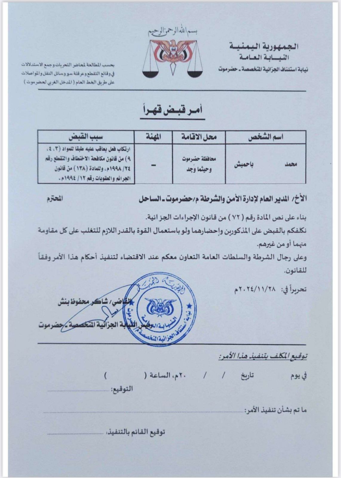 في تصعيداً جديد هو الأخطر، إصدارت النيابة الجزائية في محافظة حضرموت أوامر قبض قهرية بحق قيادات في حلف قبائل حضرموت، بينهم الشيخ خالد محسن العامري، وفائز بادبيان، وخالد باراس، بتهمة التقطع لقواطر النفط الخام لكهرباء عدن.