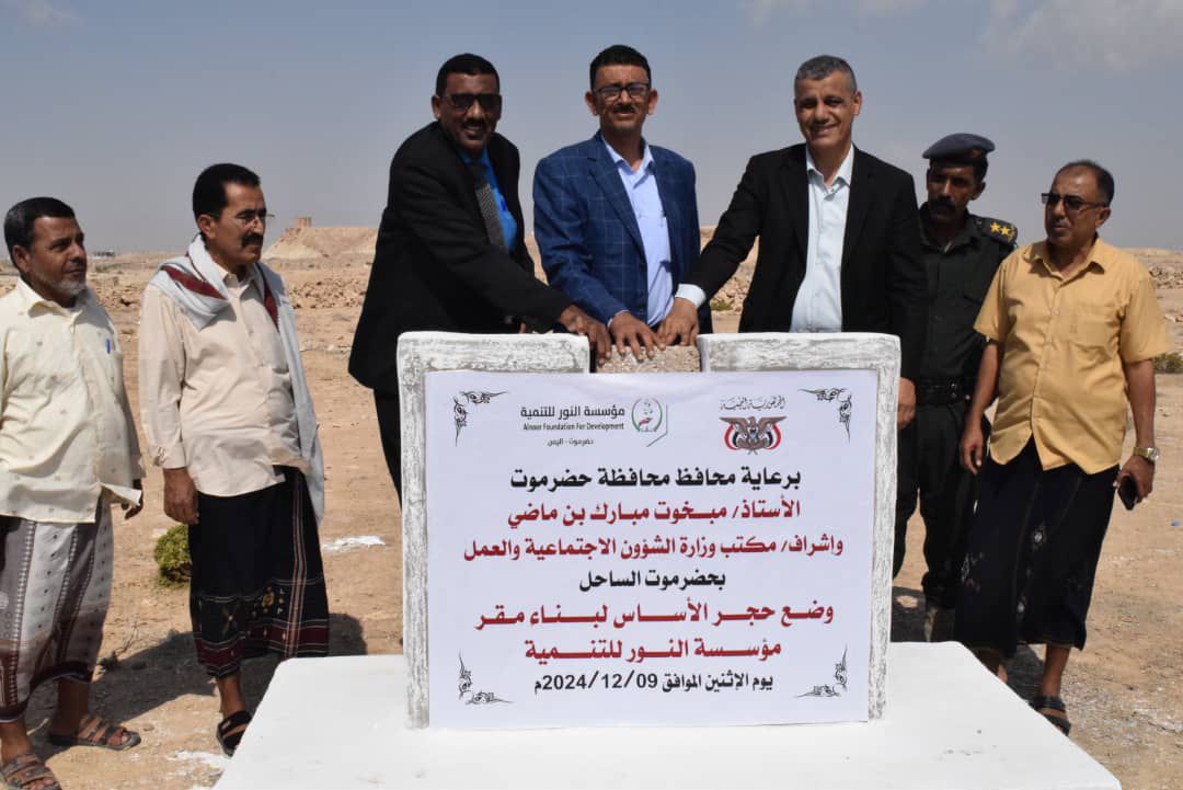 وضع المدير العام لمكتب وزارة الشؤون الاجتماعية والعمل بساحل حضرموت الأستاذ أحمد سالم باضروس، حجر الأساس لبناء مقر مؤسسة النور للتنمية، بمديرية غيل باوزير.