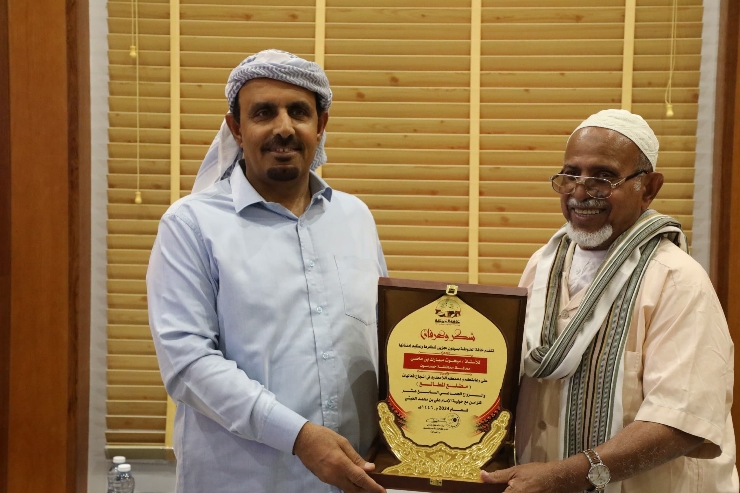 تسلّم محافظ حضرموت الأستاذ مبخوت مبارك بن ماضي، اليوم بالمكلا، درع شكر وعرفان من لجنة حافة الحوطة بمدينة سيئون تقديرًا وعرفنًا لدعمه ورعايته لفعاليات “مطلع المطالع” والزواج الجماعي الـ 17 لحافة الحوطة لعام 2024م.