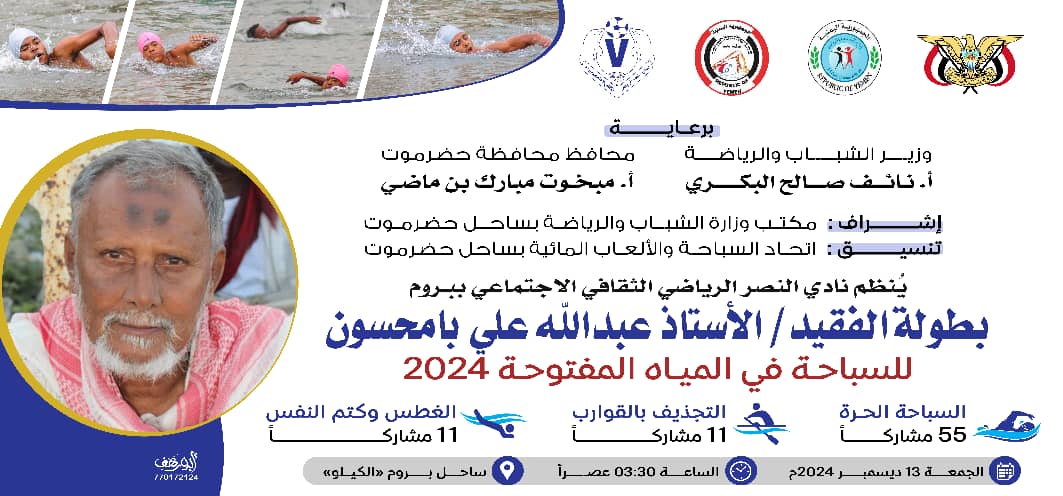 تنطلق عصر يوم غد الجمعة بساحل مدينة بروم “الكيلو”، بطولة الفقيد الاستاذ عبدالله علي بامحسون للسباحة في المياه المفتوحة، برعاية كريمة من قبل وزير الشباب والرياضة الاستاذ نايف صالح البكري، ومحافظ حضرموت الاستاذ مبخوت مبارك بن ماضي، وإشراف مكتب وزارة الشباب والرياضة بساحل حضرموت، وتنسيق اتحاد السباحة والالعاب المائية بساحل حضرموت، وتنظيم نادي النصر الرياضي الثقافي الاجتماعي ببروم.