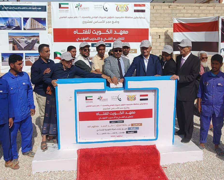 وضع وكيل محافظة حضرموت لشؤون مديريات الوادي والصحراء عامر العامري، اليوم، حجر الأساس لمشروع بناء وتأثيث معهد الكويت للفتاه للتعليم الفني والتدريب المهني بوادي حضرموت ، الذي تنفذه مؤسسة قطرات للتنمية، باشراف فريق عطاء المرأة الكويتية الانساني، بدعم كويتي.