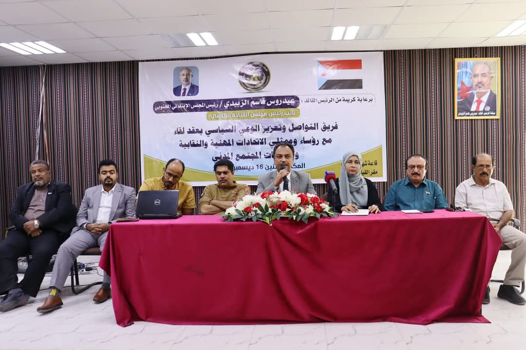 عقد فريق التواصل وتعزيز الوعي السياسي، اليوم الإثنين، لقاء مع رؤساء وممثلي الاتحادات المهنية والنقابية ومنظمات المجتمع المدني، برئاسة الأستاذ فادي حسن باعوم.