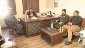 بحث مدير عام الأمن والشرطة بمحافظة حضرموت الوادي والصحراء العميد الركن عبدالله سالمين بن حبيش صباح اليوم مع رئيس نيابة استئناف سيئون القاضي فواد جابر لرضي تعزيز التعاون بين الوحدات الأمنية والنيابة العامة في تطبيق النظام والقانون.