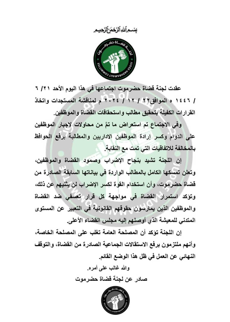 وفي الختام، أكدت اللجنة أن القضاة في حضرموت سيستمرون في مواجهة أي قرارات تعسفية ضدهم وضد الموظفين الذين يمارسون حقوقهم القانونية، وأنهم لن يتراجعوا عن مطالبهم مهما كانت الظروف.