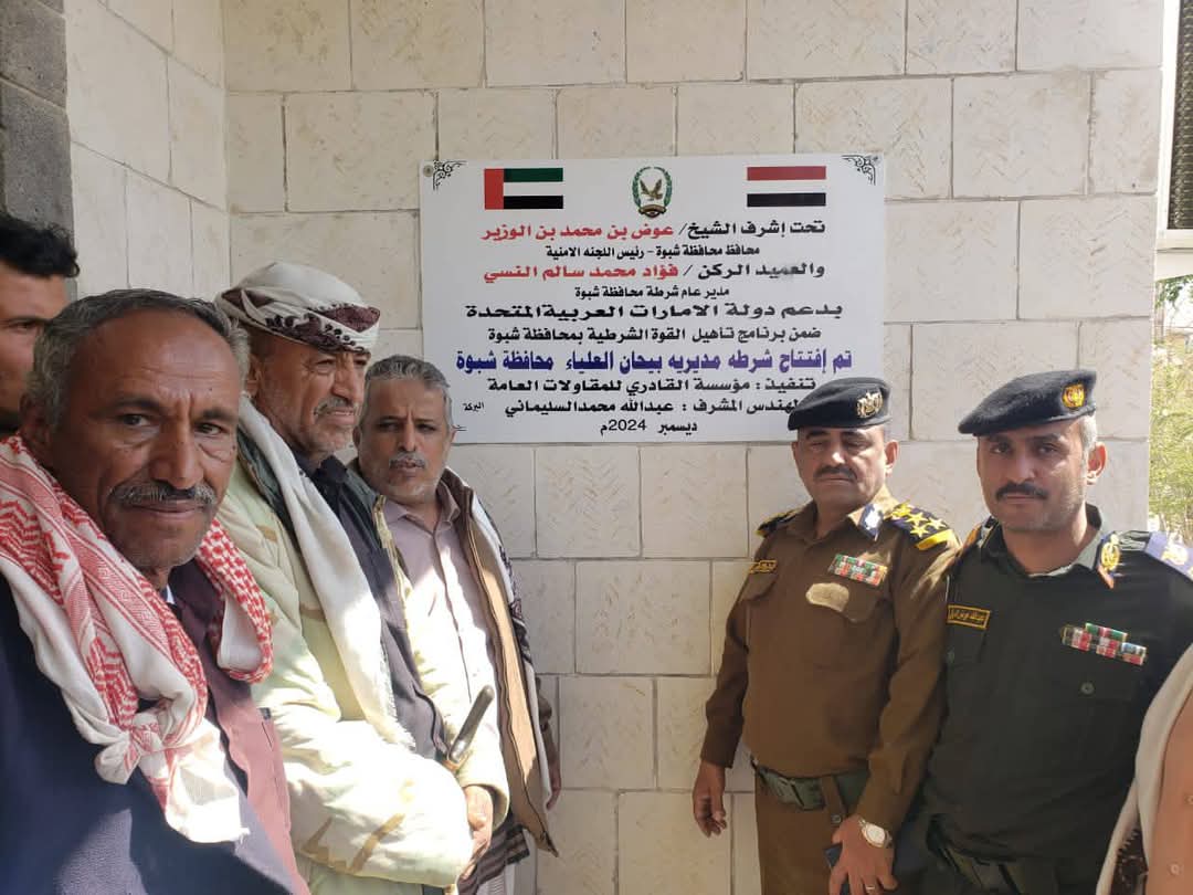 افتتح وكيل محافظة شبوة لشؤون المديريات الشمالية والغربية، العاقل محمد الفاطمي، ومدير عام شرطة محافظة شبوة العميد الركن فؤاد محمد النسي، وبحضور مدير عام مديرية بيحان محمد أحمد شيخ، ومدير أمن المديرية الرائد عبدالله عوض الجبواني، وقائد اللواء الرابع دفاع شبوة العميد فيصل الشعيبي، مبنى إدارة أمن مديرية بيحان، بعد إعادة تأهيله وتجهيزه بدعم سخي من الأشقاء في دولة الإمارات العربية المتحدة، وتنفيذ مؤسسة القادري للمقاولات العامة.