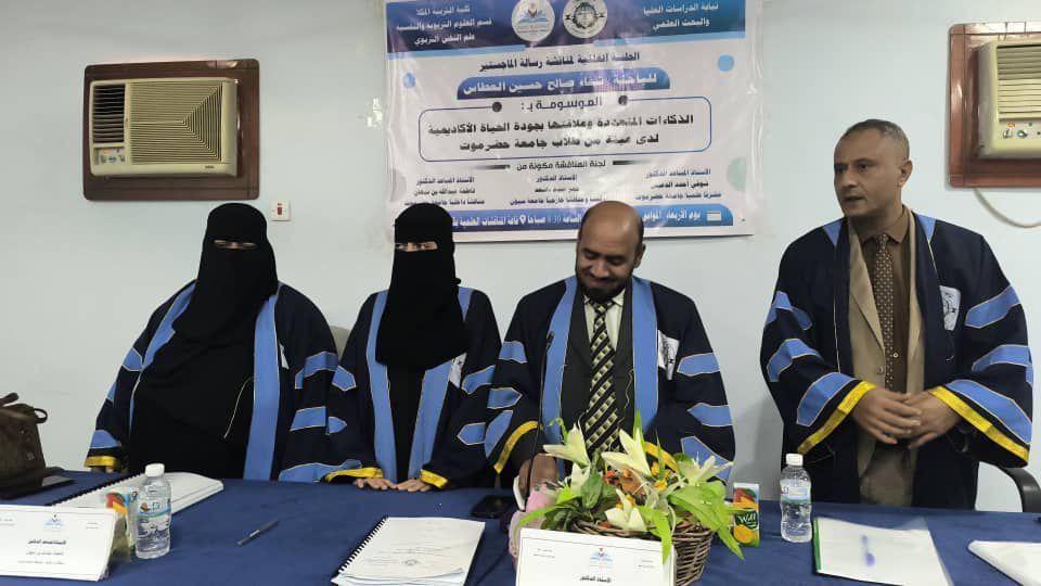 وناقشت الباحثة شفاء صالح حسين العطاس رسالتها الموسومة بـ“الذكاءات المتعددة وعلاقتها بجودة الحياة الأكاديمية لدى عينة من طلاب جامعة حضرموت”، وهدفت الدراسة إلى دراسة تأثير الذكاءات المتعددة على جودة الحياة الأكاديمية، مع تسليط الضوء على دورها في تحسين الأداء التعليمي للطلاب.