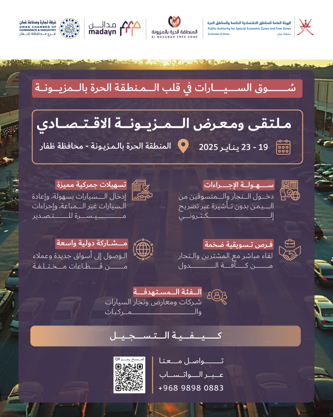 ينظم في المنطقة الحرة بمحافظة ظفار بسلطنة عمان، ملتقى ومعرض المزيونة الاقتصادي بمشاركة رجال الأعمال والشركات في اليمن