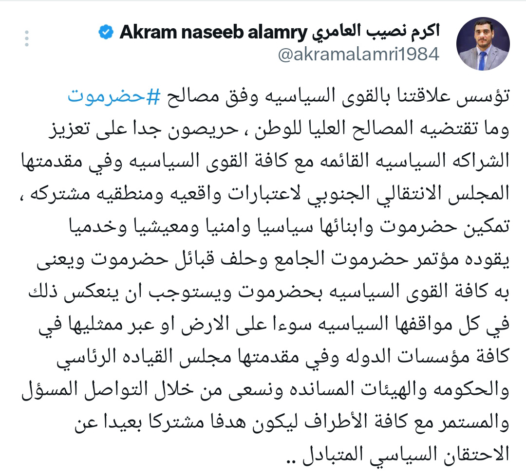 أوضح أمين عام مؤتمر حضرموت الجامع، القاضي أكرم نصيب العامري، في تغريدة له على منصة إكس أن العلاقة مع القوى السياسية تُبنى على أساس مصالح حضرموت والمصلحة العليا للوطن. وأكد العامري حرص المؤتمر على تعزيز الشراكة السياسية مع كافة القوى السياسية، وفي مقدمتها المجلس الانتقالي الجنوبي، مشيرًا إلى وجود اعتبارات واقعية ومنطقية مشتركة تربط الجانبين.
