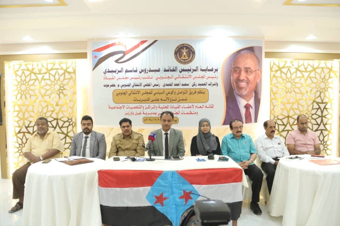 عقد فريق التواصل وتعزيز الوعي السياسي، برئاسة عضو هيئة رئاسة المجلس الانتقالي الجنوبي، الأستاذ فادي حسن باعوم، اليوم الاثنين، لقاءً موسعاً بالقيادة المحلية والشخصيات الاجتماعية ومنظمات المجتمع المدني والمرأة بمديرية غيل باوزير.