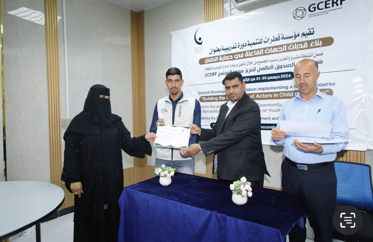 اختتمت بمحافظة مأرب، اليوم، دورة تدريبية خاصة ببناء قدرات العاملين في مجال حماية الطفل في الجهات الحكومية ومنظمات المجتمع المدني، نظمها مكتب الشؤون الاجتماعية والعمل، بالشراكة مع مؤسسة قطرات للتنمية.