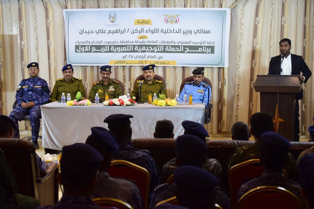 دشنت إدارة التوجيه المعنوي والعلاقات العامة بشرطة محافظة حضرموت الوادي والصحراء برنامج الحملة التوجيهية التعبوية للربع الاول من العام الجاري 2025م بنتظيم محاضرات توعوية برعاية من معالي وزير الداخلية اللواء الركن ابراهيم علي حيدان.