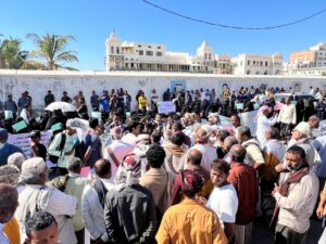 شهدت مدينة المكلا عاصمة محافظة حضرموت، صباح اليوم الخميس، وقفة احتجاجية كبرى أمام ديوان المحافظة، نظمتها القوى المدنية والحقوقية الجنوبية بالمحافظة، بمشاركة حاشدة من المواطنين والمهنيين والحرفيين وموظفي الدوائر الحكومية والقطاعين العام والخاص، تنديدا بالواقع وتطالب بتحسين الأوضاع المعيشية والاقتصادية.