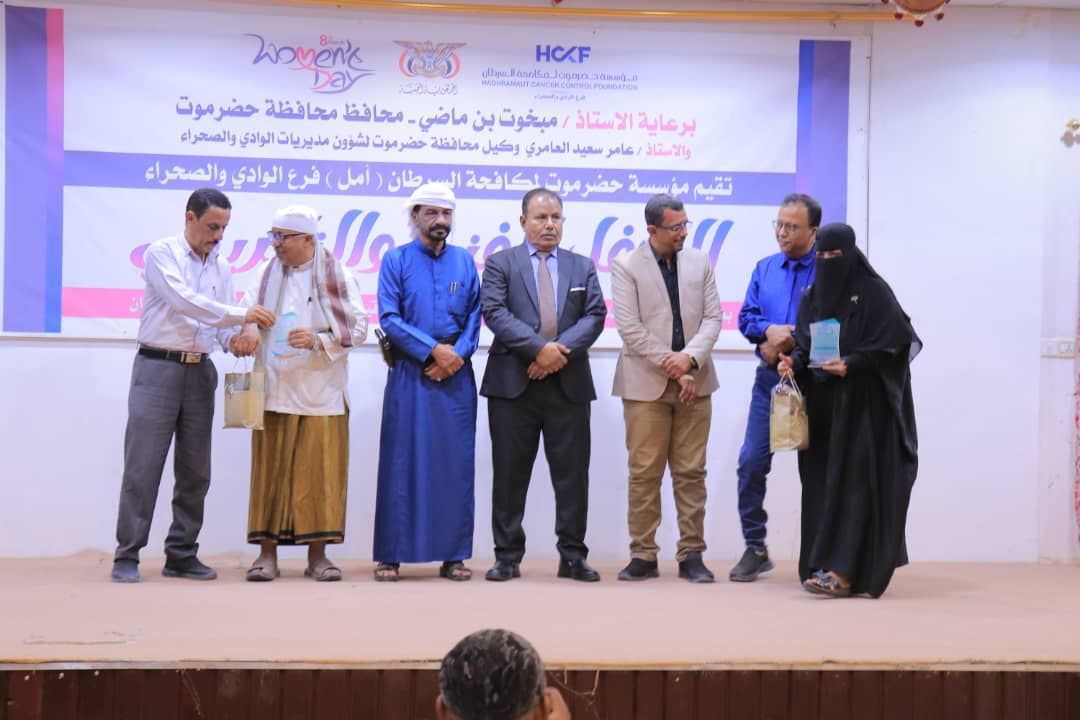 أقامت مؤسسة حضرموت لمكافحة السرطان (أمل)فرع وادي وصحراء حضرموت، صباح اليوم، بمدينة سيئون، حفلاً خطابياً وتكريمياً، تزامناً مع اليوم العالمي للمرأة الموافق 8 مارس والأحتفال بعيد الأم 21مارس وذلك إحتفاء بالناجيات من مرض السرطان.