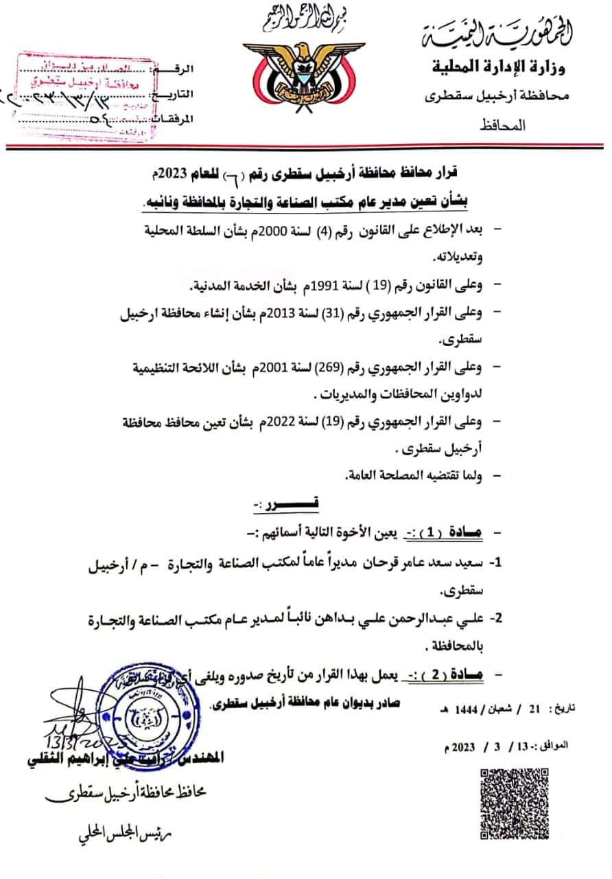أصدر محافظ أرخبيل سقطرى المهندس رأفت علي إبراهيم الثقلي اليوم، قرار رقم (6) للعام 2023م، قضى في مادته الأولى بتعيين الأستاذ سعيد سعد عامر قرحان مديراً عاماً لمكتب الصناعة والتجارة بالمحافظة.