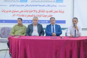 دشن وكيل محافظة حضرموت لشؤون مديريات الوادي والصحراء الاستاذ عامر سعيد العامري، اليوم، ورشة العمل حول تحديد المشاكل والإحتياجات للقطاع الصحي على مستوى مديريات الوادي والصحراء للعام 2025م والتي تنفذها إدارة الرعاية الصحية الأولية بتمويل مكتب الصحة والسكان بالوادي والصحراء.