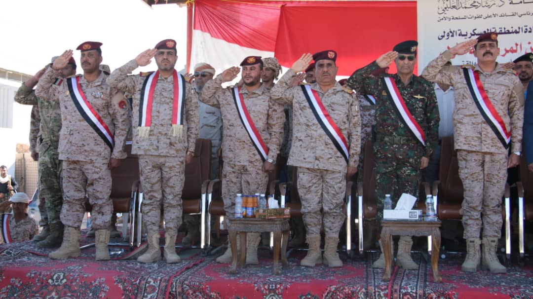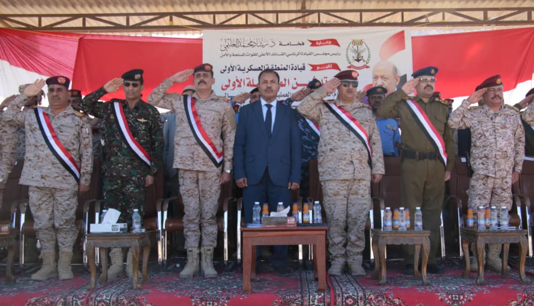 واشار قائد المنطقة العسكرية الاولى اللواء الركن / صالح محمد الجعيملاني في كلمته الى تمسك كل منتسبي المنطقة العسكرية الاولى بالثوابت الوطنية والاصطفاف خلف القيادة السياسية والعسكرية في كل ما تتخذه من قرارات لمصلحة الوطن، ودحر الانقلاب، مؤكداً الاستمرار وبثبات على تنفيذ المهام المسندة والمتمثلة في مكافحة الإرهاب ومواجهة التهريب والحفاظ على مؤسسات الدولة والممتلكات العامة والخاصة.